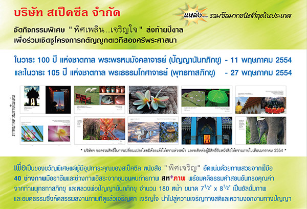บริษัท สเป็คซีล จำกัด ขอร่วมเชิดชูโครงการกตัญญูกตเวทีต่อสองศรีพระศาสนา ด้วยการจัดกิจกรรม “พิศเพลิน เจริญใจ” เพื่อเป็นของขวัญพิเศษแด่ผู้มีอุปการะคุณของสเป็คซีล โดยมอบหนังสือ “พิศเจริญ” ที่อัดแน่นด้วยภาพสวยจากฝีมือ 40 ช่างภาพมืออาชีพ และช่างภาพอิสระจากชุมชนคนถ่ายภาพ สห + ภาพ พร้อมคติธรรมคำสอนอันทรงคุณค่าจากท่านพุทธทาสภิกขุ และหลวงพ่อปัญญานันทภิกขุ จำนวน 180 หน้า ขนาด 7*12นิ้ว เป็นอัลบั้มภาพและอมตธรรมซึ่งคัดสรรผลงานภาพที่ดูแล้วเจริญตา เจริญใจ นำไปสู่ความเจริญทางสติและความงอกงามทางปัญญา