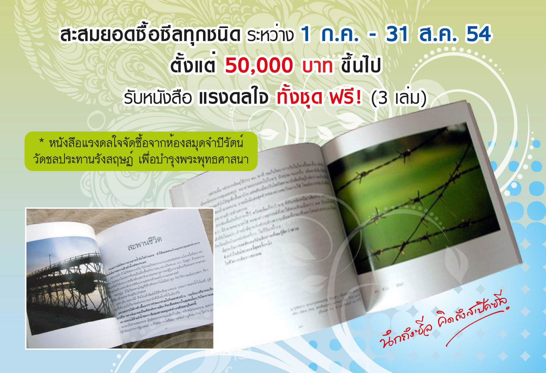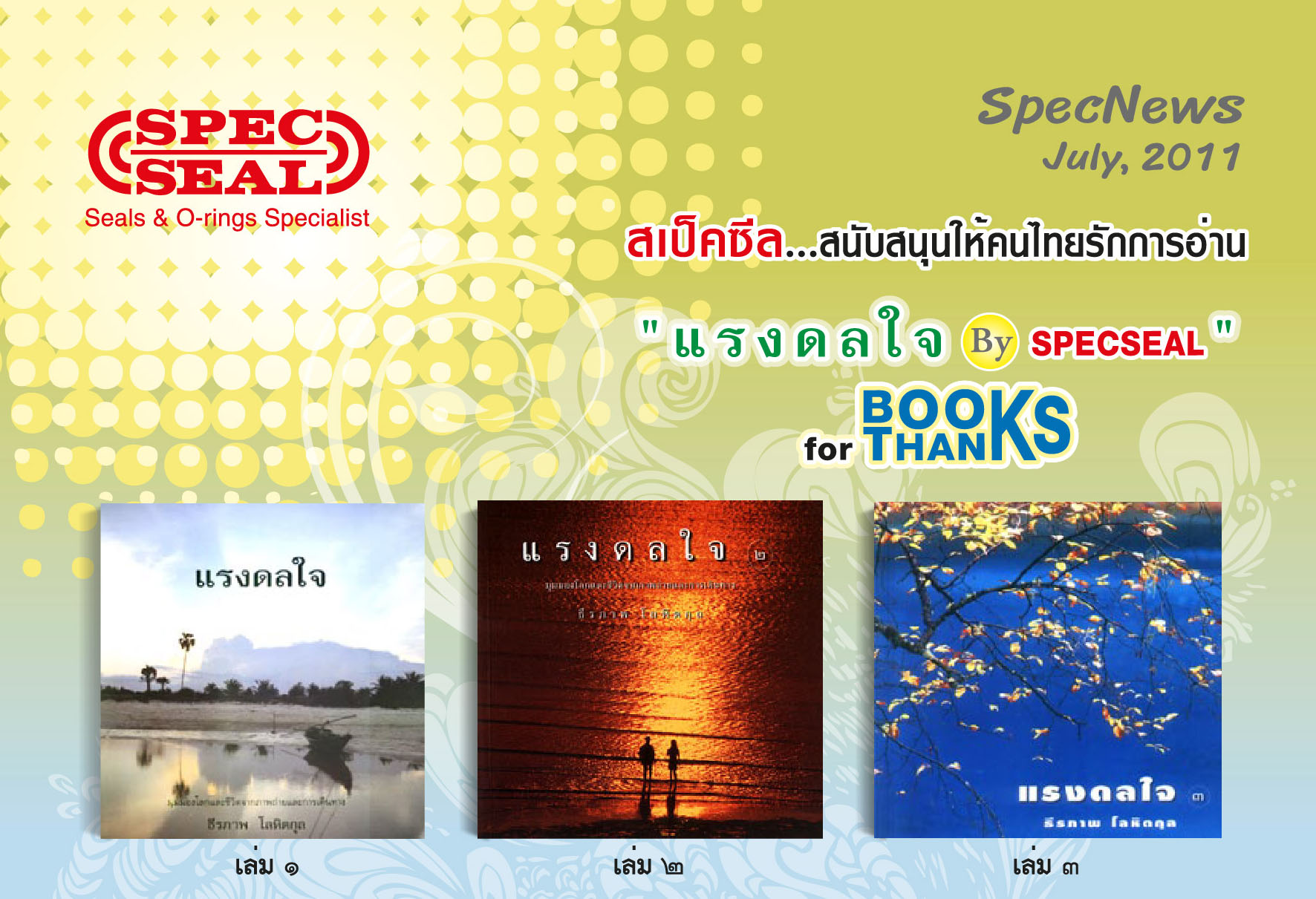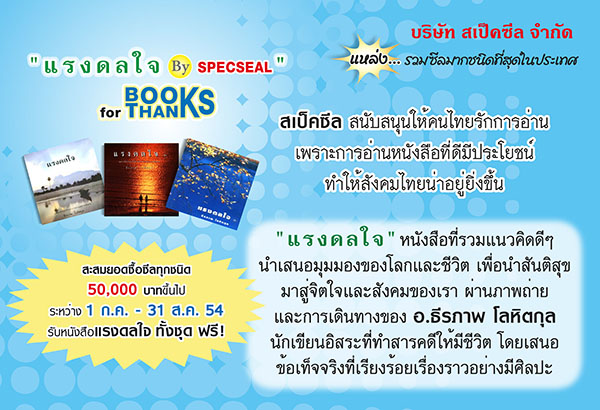 สเป็คซีล สนับสนุนให้คนไทยรักการอ่าน เพราะการอ่านหนังสือที่ดีมีประโยชน์จะทำให้สังคมน่าอยู่ขึ้น กับกิจกรรมพิเศษ “แรงดลใจ By Specseal” Books for Thanks ทั้ง 4 สำนักงาน เพียงสะสมยอดซื้อซีลทุกชนิด 50,000 บาทขึ้นไป ระหว่างวันที่ 1 ก.ค.-31 ส.ค.54 สเป็คซีลมีความยินดีมอบหนังสือแรงดลใจทั้งชุด ซึ่งมี 3 เล่มด้วยกัน ให้ทุกท่านที่สะสมครบตามเงื่อนไขได้รับหนังสือดีๆ ฟรี!!