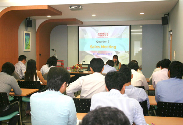 เมื่อวันที่ 22 ตุลาคม ที่ผ่านมา บริษัท สเป็คซีล จำกัด จัดประชุมสรุปผลการทำงานไตรมาส 1-3 ปี 2555 รวมถึงได้แบ่งปันความรู้เรื่องการทำงานเป็นทีมที่มีประสิทธิภาพ และให้พนักงานขายที่ทำตัวเลขได้ดีที่สุดของแต่ละสำนักงานมาแนะนำเทคนิคในการพิชิตยอดขายให้กับพนักงานขายท่านอื่นๆได้นำไปประยุกต์ใช้ในการประชุมครั้งนี้ คุณอุไรวรรณ์ จิระวัฒน์พงษ์ศา กรรมการรองผู้จัดการได้เน้นให้พนักงานตระหนักถึงความสำคัญของภาษาอังกฤษ English Communication in office เพื่อสร้างความพร้อมก่อนเปิด AEC ในปี 2558 ที่กำลังจะมาถึง