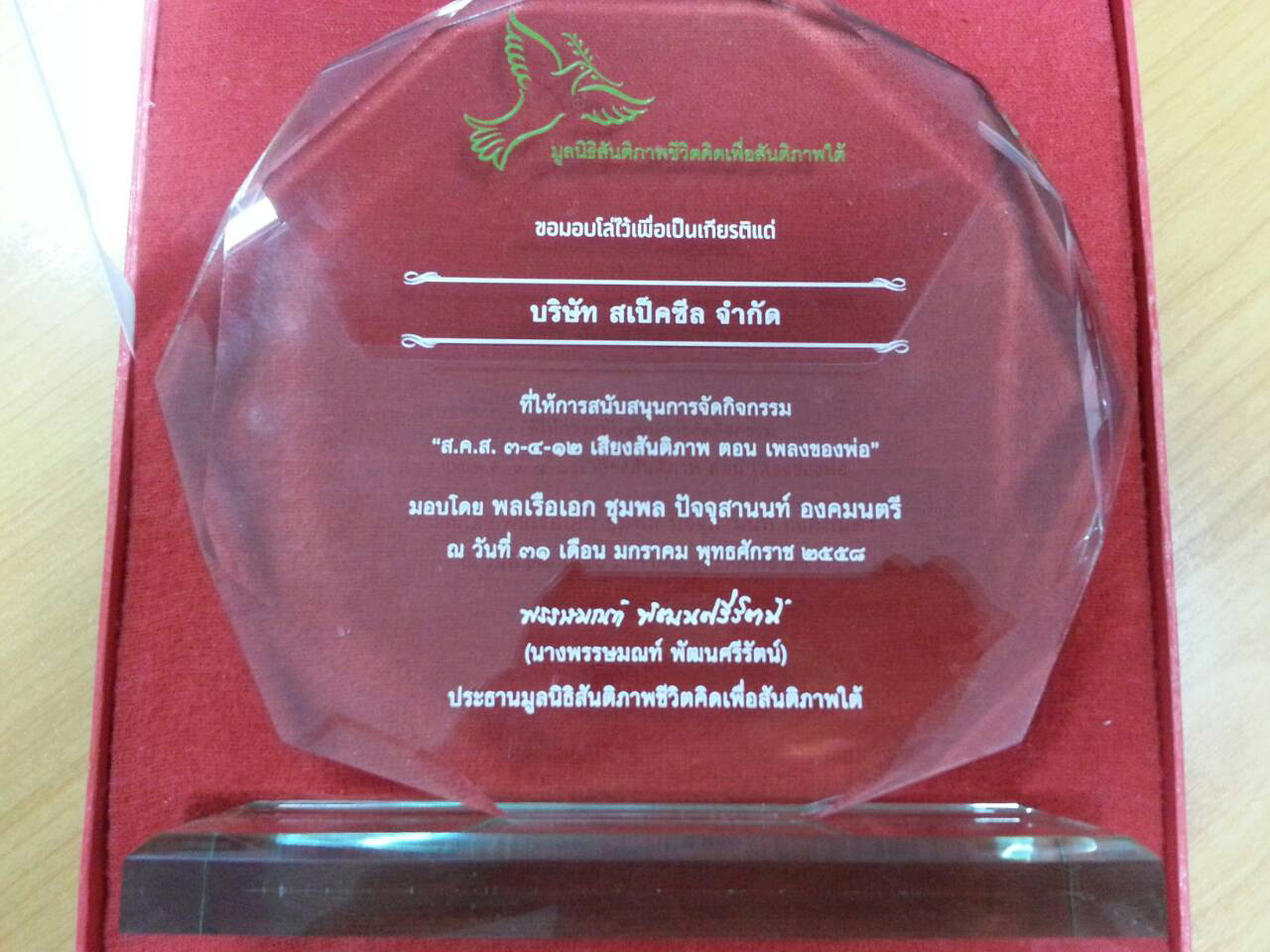 ทางมูลนิธิสันติภาพชีวิต คิดเพื่อสันติภาพใต้ ได้จัดงาน “ส.ค.ส. 3-4-12 เสียงสันติภาพ ตอน เพลงของพ่อ” ขึ้น และได้มอบโล่ประกาศเกียรติคุณให้กับสเป็คซีลที่ได้ให้การสนับสนุนกิจกรรมจัดทำเสื้อเกราะดังกล่าวมาอย่างต่อเนื่อง โดยมีพลเรือเอก ชุมพล ปัจจุสานนท์ องคมนตรี เป็นผู้มอบ เมื่อวันที่ 31 มกราคม 2558 ที่ผ่านมา