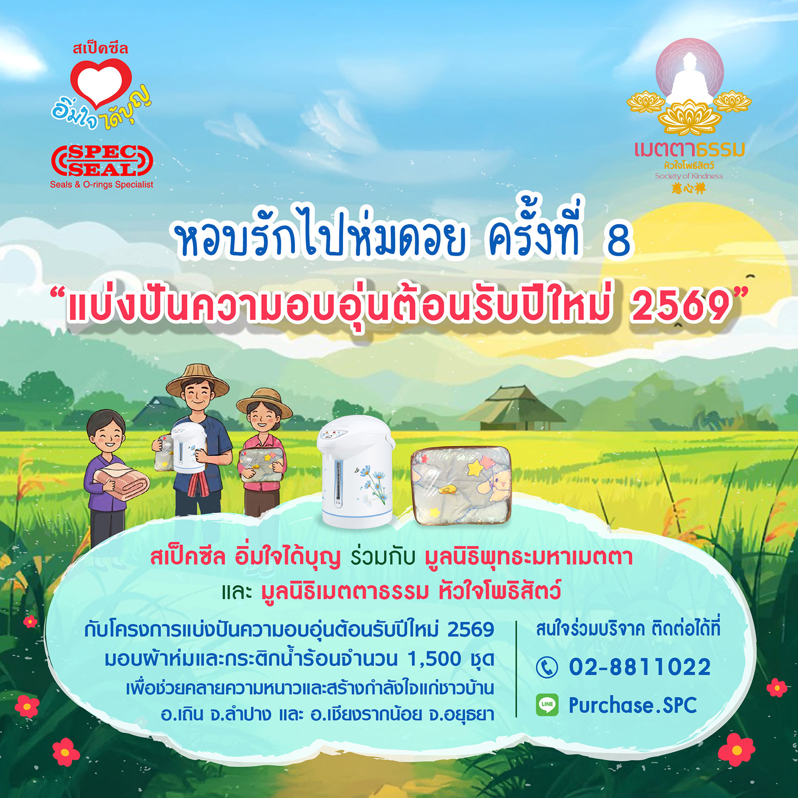 สเป็คซีล ร่วมกับ มูลนิธิพุทธะมหาเมตตา และมูลนิธิเมตตาธรรม หัวใจโพธิสัตว์ กับ โครงการแบ่งปันความอบอุ่นต้อนรับปีใหม่ 2569 มอบผ้าห่มและกระติกน้ำร้อนจำนวน 1,500 ชุด เพื่อช่วยคลายความหนาวและสร้างกำลังใจแก่ชาวบ้าน อ.เถิน จ.ลำปาง และ อ.เชียงรากน้อย จ.อยุธยา